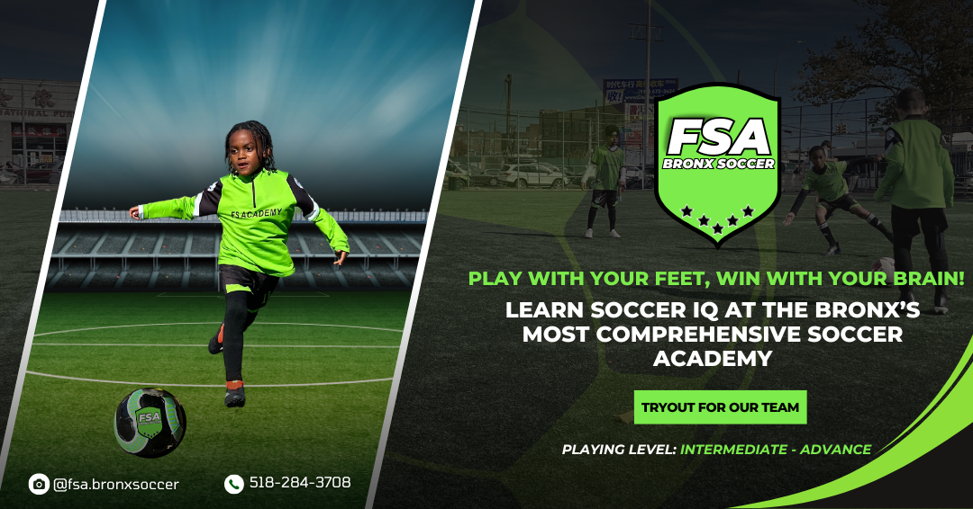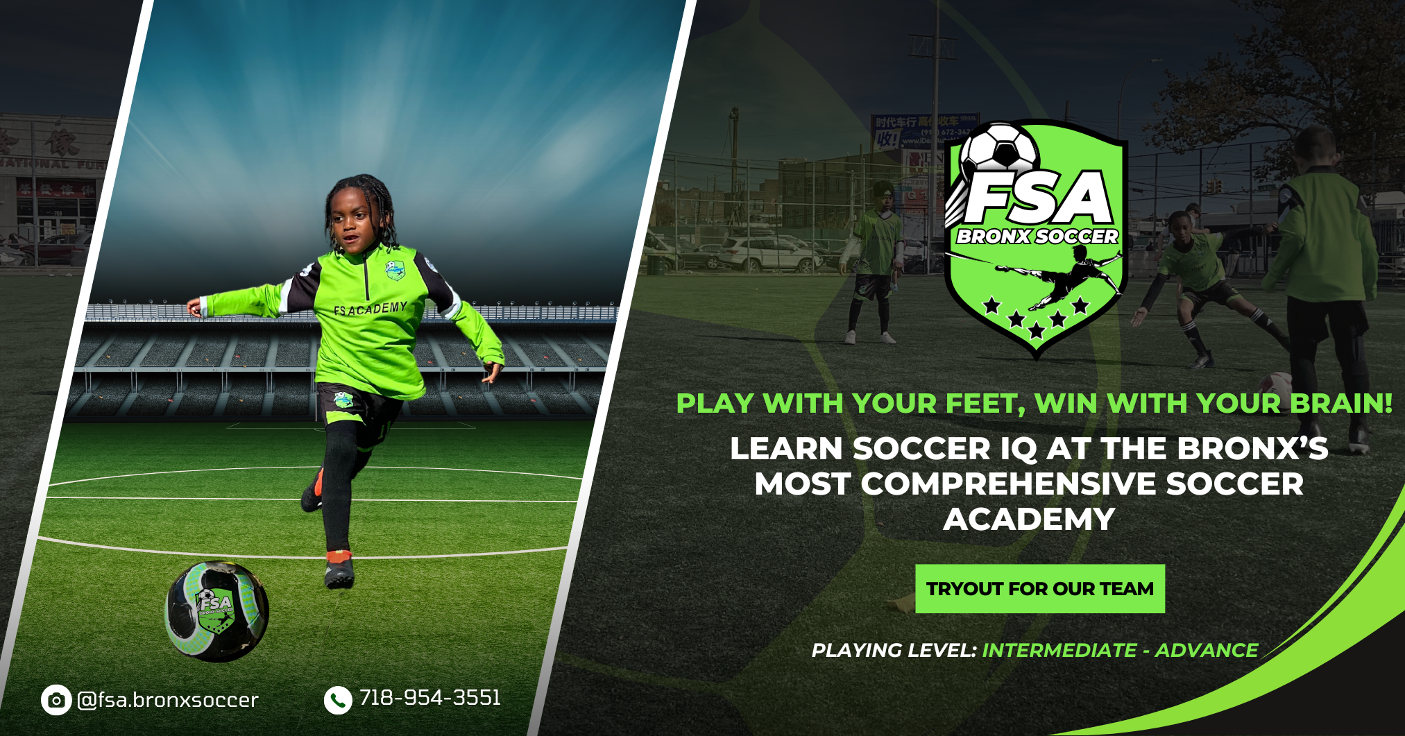 FSA Bronx Soccer is dedicated to developing young soccer players in the Bronx by focusing on one key element: Soccer IQ. Our comprehensive program serves players ages 5-15, teaching them to see the game from a bird's eye view and make quick, intelligent decisions.